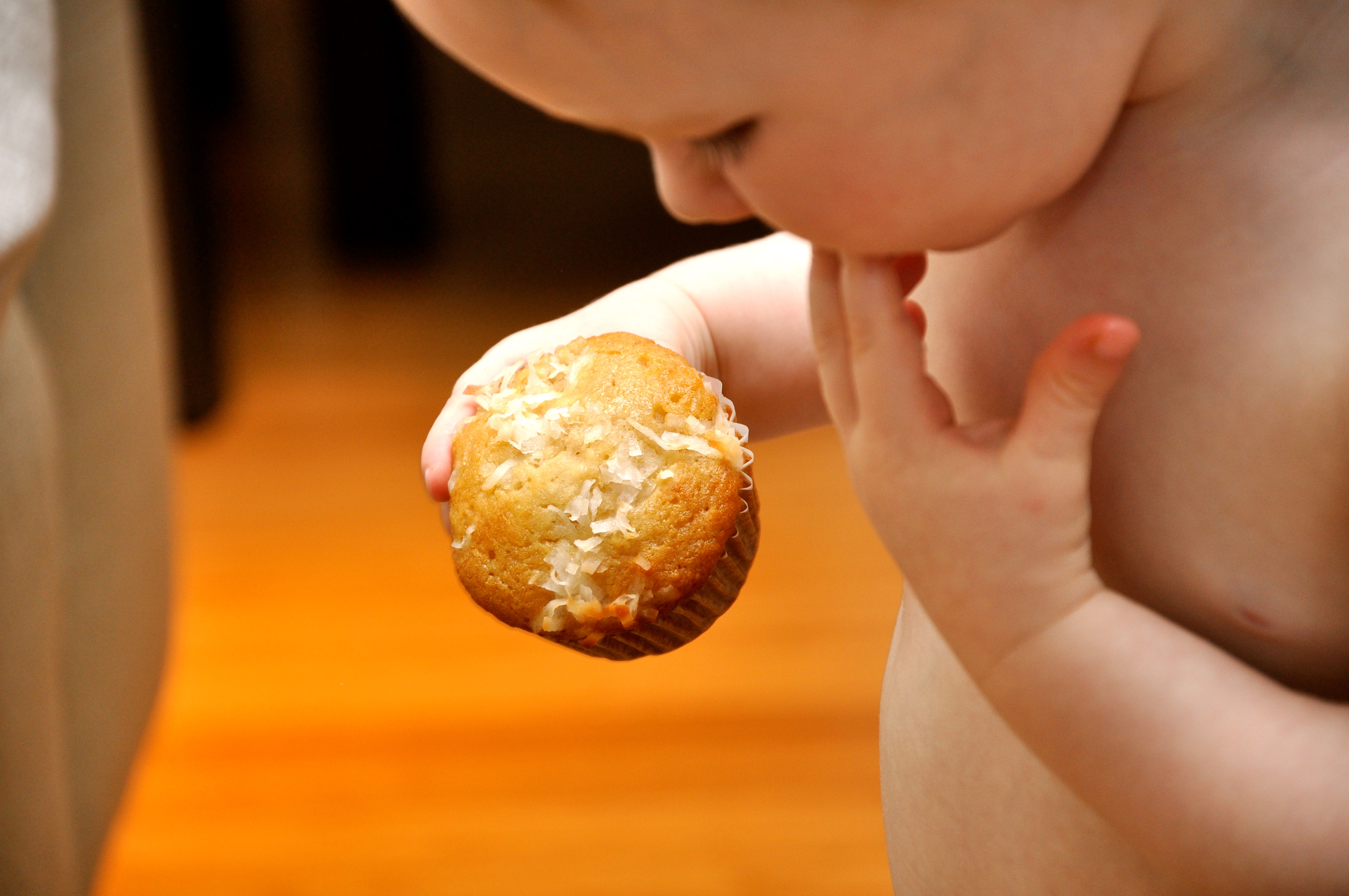 The tops round out nicely, in golden brown. The coconut flakes form toasty edges on top. Call these “muffins” if you like, but these are like CAKE.